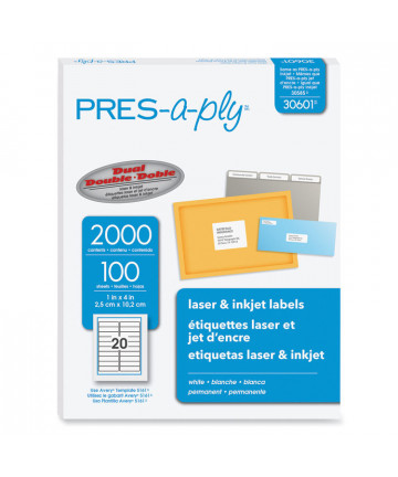 Add to cart Labels, Laser Printers, 1 x 2.63, White, 30/Sheet, 100... $60.17 Economical PRES-a-ply® labels can be used for almost every addressing and identification need. Great for high-volume, low-cost printing. 8 1/2" x...