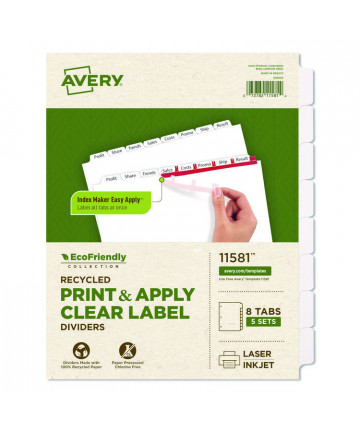 Add to cart Index Maker EcoFriendly Print and Apply Clear Label... $48.98 Dividers are made of post-consumer recycled materials and are processed chlorine-free. Clear labels virtually disappear when applied to tabs. Label...