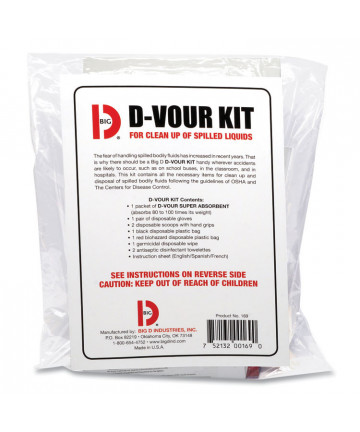 Add to cart D'vour Clean-up Kit, Powder, All Inclusive Kit, 6/Carton $117.29 Kit contains all you need for handling spills of blood, urine, feces, food and other organic substances. Contains a packet of D-Vour, one pair of...
