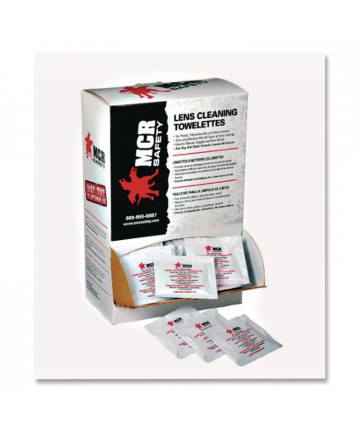 Add to cart Lens Cleaning Towelettes, 100/Box $9.75 Premoistened towelettes are safe to use on plastic, polycarbonate and glass lenses. Specialized solution reduces fogging. Individual-use packets...