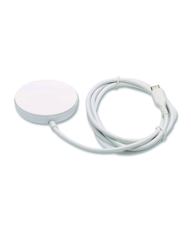 Who wants to plug and unplug power cords when you want to charge your iPhone? Make charging easier by doing it wirelessly. Just place your Qi-certified iPhone (iPhone 12 and above) on the 15 W charging pad. That's all there is to it. Connect no cable to your phone. Developed and tested to MFi standards. Built-in MagSafe technology helps ensure your iPhone and the wireless charging pad work together for a complete charge whenever you need it. Magnets inside both your phone and the charging pad prevent the iPhone from falling off the charger and being disconnected while charging. MagSafe also allows the charger to deliver up to 15 W of power to get your iPhone to battery capacity even faster. You can charge your iPhone while it lays flat on the charging pad, or you can use the adjustable kickstand for flexible placement during charging. You can place the phone vertically to read notifications and messages while it charges or horizontally to stream video. A device that supports non-magnetic wireless charging can only be charged while laying flat on the charging pad. Takes up hardly any space, making it ideal for your bedside table or for carrying in a backpack or laptop bag. A built-in five-ft USB-C cable connects the charging pad to a wall charger.