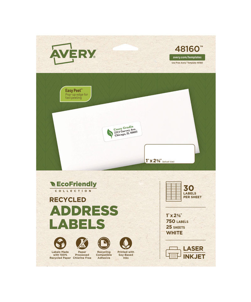 A natural choice for doing right by the environment. EcoFriendly mailing labels are made of 100% recycled material, processed Chlorine Free and printed using soy based ink. Easy to customize with free templates from Avery® Design & Print. 8.5 x 11 sheets for laser and inkjet printers.