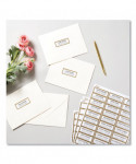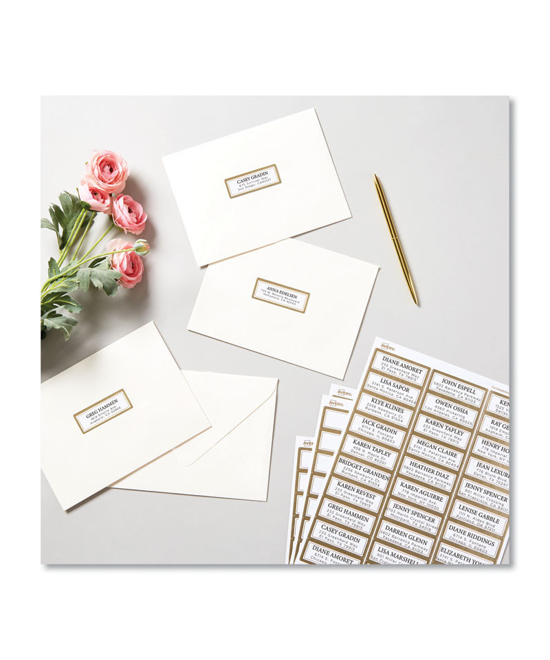 Remarkably reflective and elegant, Avery matte white rectangle labels with metallic gold borders bring a strikingly radiant shine to any event or project. Each rectangle label is pre-printed with a brilliant gold foil-like border that is guaranteed to capture people's attention. Avery Easy Peel technology makes it simple and easy to peel and place multiple labels quickly. Just bend back the label sheet to expose the pop up edges to peel away each label without risking ripping or tearing. Using a strong permanent adhesive, every label can stick and stay to a variety of surfaces including cardboard, envelopes, paper, glass, metal and more. Create beautiful designs and make your own address labels, wedding RSVP labels, party favor labels, product labels, food labels, holiday cards and more using the free design software and templates at avery.com/templates. Compatible with both laser and inkjet printers.