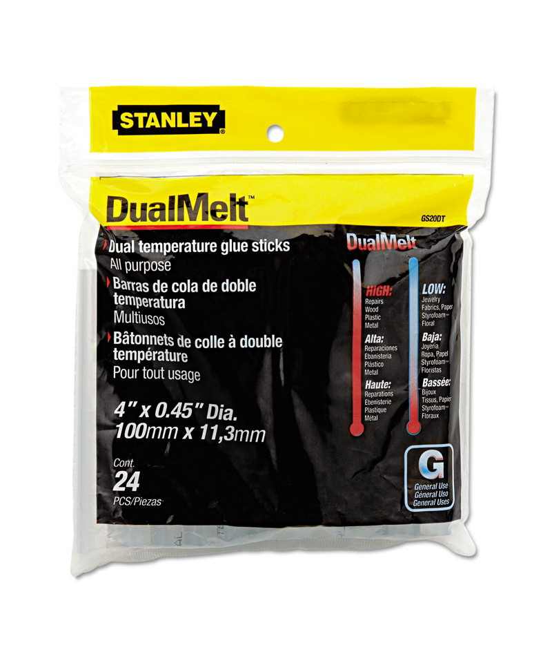 The Stanley GS20DT Dual Temperature Glue Sticks are designed for use in standard hot melt, low temperature and dual temperature glue guns. Excellent for bonding heat-sensitive materials, as well as general applications, these standard diameter glue sticks and are for use with Stanley GR20, GR25 and GR100 Glue Guns.