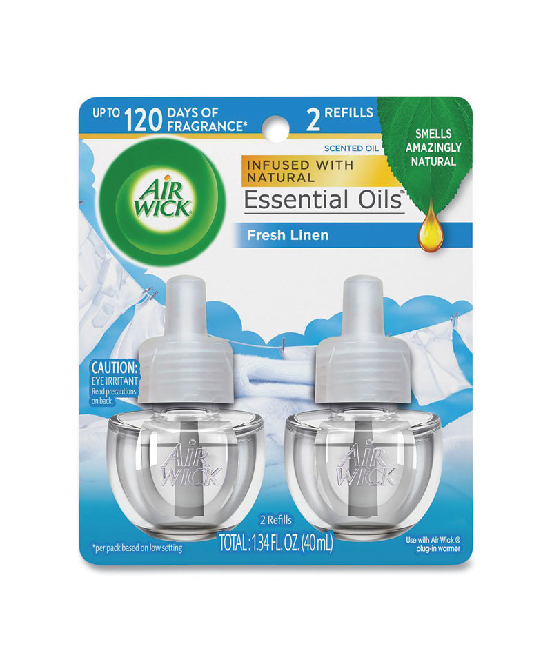 Leave a lasting impression on guests and ensure a consistent experience with Air Wick Scented Oil Refills with Essential Oils. Keep supply rooms stocked with the pleasant scents your guests come to associate with your business. Get up to 60 days per refill, on the lowest warmer setting, of natural-smelling fragrance with essential oil-infused formulas. Easily refill the Air Wick plug-in warmer by unscrewing the cap and inserting the refill until it clicks. Adjust the warmer settings to ensure the optimal fragrance for each room. Enhance entrances, common areas, offices, breakrooms and guest rooms with pleasant scents.