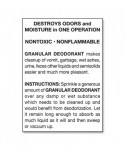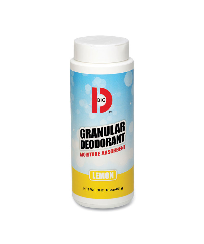 BIG D® GRANULAR DEODORANT destroys odors and absorbs moisture in one operation. Designed to be sprinkled on and vacuumed or swept away, it is excellent for garbage cans, dumpsters, pet shops and kennels. The dried clay which forms the base of GRANULAR DEODORANT absorbs moisture rapidly, and the BIG D® deodorant in it destroys all odors on contact. Designed to be used on areas affected by vomit, feces, wet garbage, oils and more. GRANULAR DEODORANT may be mixed with sand in smoking stands, or used as cat litter.