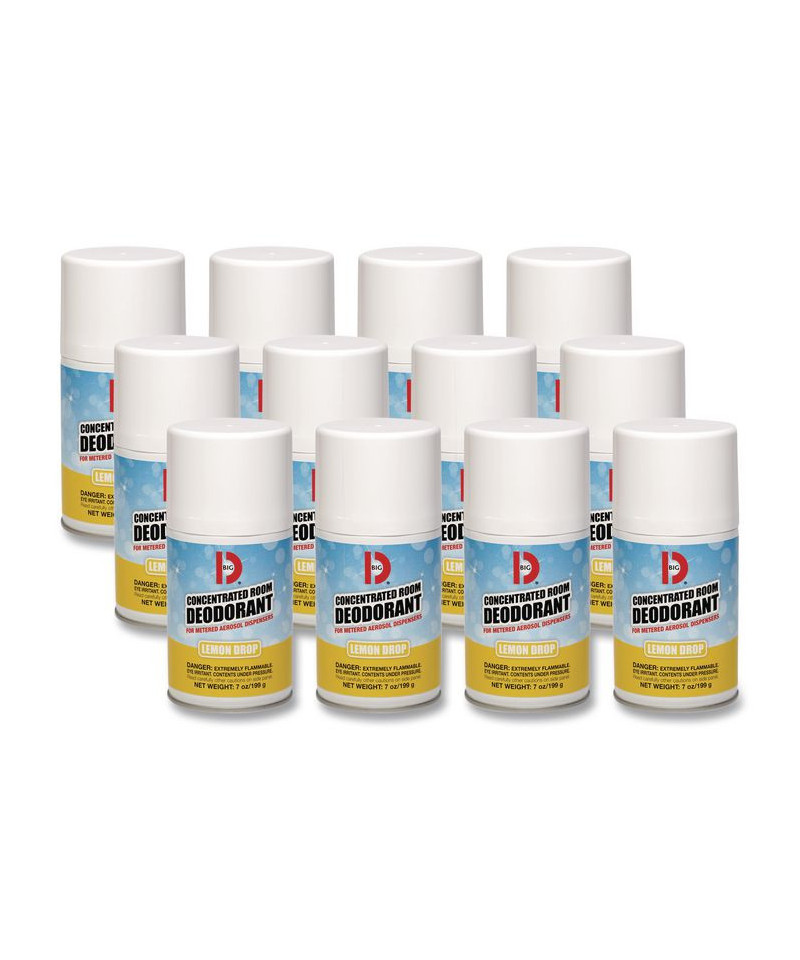 Eliminate odors instead of just masking them, with a concentrated deodorant and odor neutralizer. A uniform actuator valve allows this can to be used in most metered aerosol dispensers. A long lasting fresh scent ensures a pleasant environment. CONCENTRATED ROOM DEODORANT for Metered Aerosol Dispensers is a true BIG D odor counteractant specially formulated for industrial and institutional needs. The formula contains no 1-1-1 Trichloroethane or fluorocarbons. BIG D offers an assortment of pleasant fragrances containing our special deodorizers that neutralize odors rather than mask them. The uniform actuator valve enables the aerosol canister to be used in BIG D METERED AEROSOL DISPENSERS. Each 7 oz. can contains approximately 3,400 sprays and effectively deodorizes a 6,000 cu. ft. area.