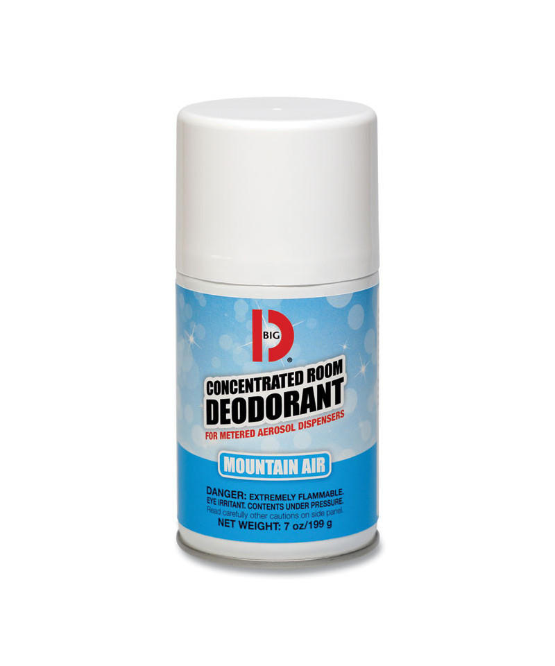 Eliminate odors instead of just masking them, with a concentrated deodorant and odor neutralizer. A uniform actuator valve allows this can to be used in most metered aerosol dispensers. A long lasting fresh scent ensures a pleasant environment. CONCENTRATED ROOM DEODORANT for Metered Aerosol Dispensers is a true BIG D odor counteractant specially formulated for industrial and institutional needs. The formula contains no 1-1-1 Trichloroethane or fluorocarbons. BIG D offers an assortment of pleasant fragrances containing our special deodorizers that neutralize odors rather than mask them. The uniform actuator valve enables the aerosol canister to be used in BIG D METERED AEROSOL DISPENSERS. Each 7 oz. can contains approximately 3,400 sprays and effectively deodorizes a 6,000 cu. ft. area.