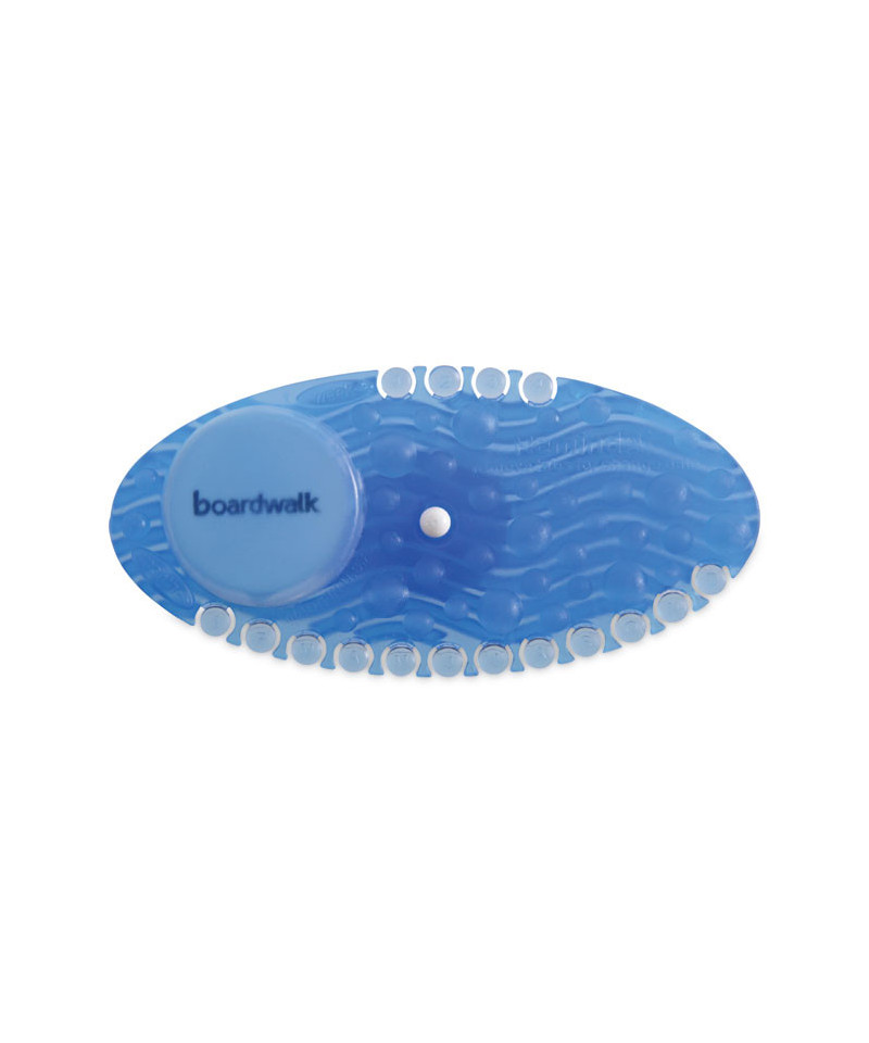 Boardwalk® Curve Air Freshener is convenient way to mask unpleasant odors with consistent odor control. Place these air fresheners anywhere with the accompanying easy-to-use, clip holder. Each freshener is individually wrapped to seal in scent and freshens consistently for 30 days. Includes five fasteners per box. The unique date tabs allow you to easily keep track of replacement, ensuring a consistently fresher smelling area. The powerful scent contains 50-100x more fragrance than standard rimsticks.