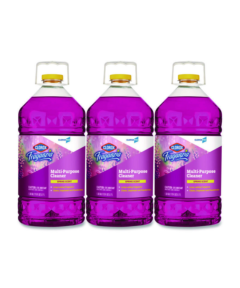 Clorox® Fraganzia® Multi-Purpose Cleaner is the perfect cleaner for areas where strong odors build up. This versatile cleaner can be used on wide variety of jobs and nonporous surfaces including floors, tiles, countertops, sinks, and toilet bowls. Plus it deodorizes and eliminates undesirable odors such as those found in garbage cans, daycare diaper pails, kennels and veterinary facilities. Leaves behind a pleasant, long-lasting fresh, clean scent after the job is done. It can also be used for freshening clothes or linens in the wash, such as smelly restaurant aprons, bar and table mops, work uniforms and cleaning towels. The large size bottle is perfect for use in offices, daycare centers, restaurants, school and other commercial facilities. Keep your facility clean and fresh smelling with Clorox® Fraganzia® Multi-Purpose Cleaner CloroxPro®.