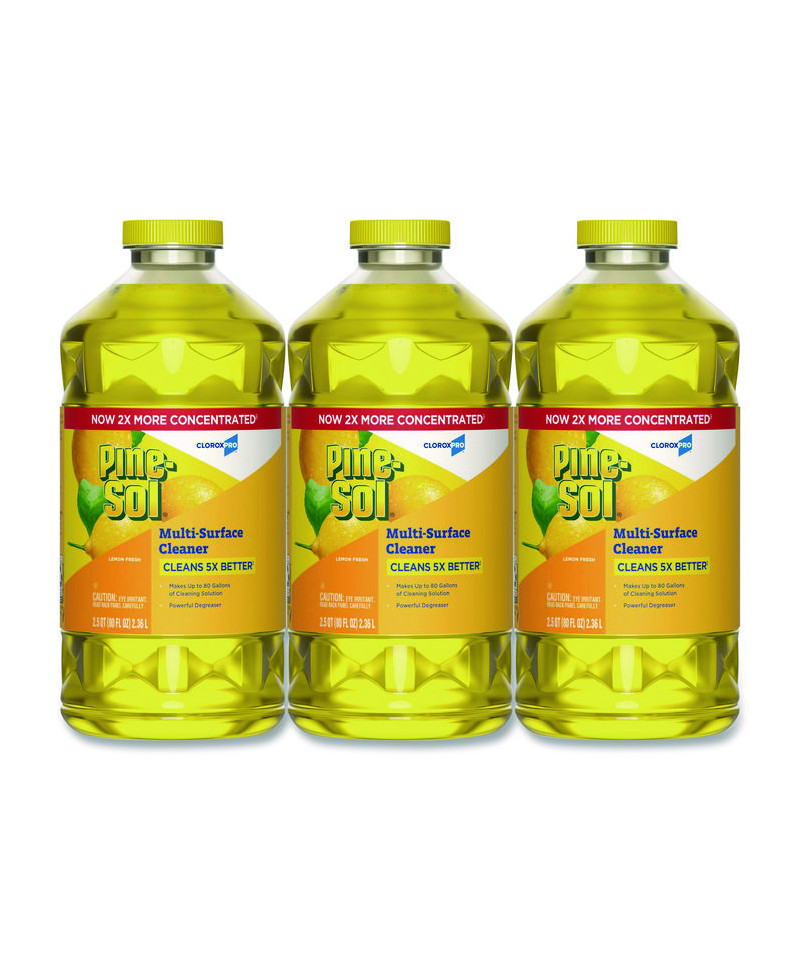 With Pine-Sol® Multi-Surface Cleaner from CloroxPro®, you only need one cleaner to fight tough dirt, grease and grime. This 2x concentrated formula delivers more cleaning power per drop and cleans 5x better than the previous Pine-Sol® scented formula. Easier to handle and easier to store, the space saving bottle size gives you more cleaning solution in a smaller bottle made of 30% less plastic. This multipurpose cleaner cleans right the first time, removing stains and deodorizing soft surfaces while leaving a pleasant scent. This powerful degreaser cuts through grime and soap scum fast and is safe for use on wood, tile, stone, porcelain and glass and more when used as directed on hard nonporous surfaces. Do not use on marble, aluminum, copper or wood that is unfinished, unsealed, unpainted, waxed, oiled or worn. Ideal for offices, daycares, schools, hotels, restaurants and more.