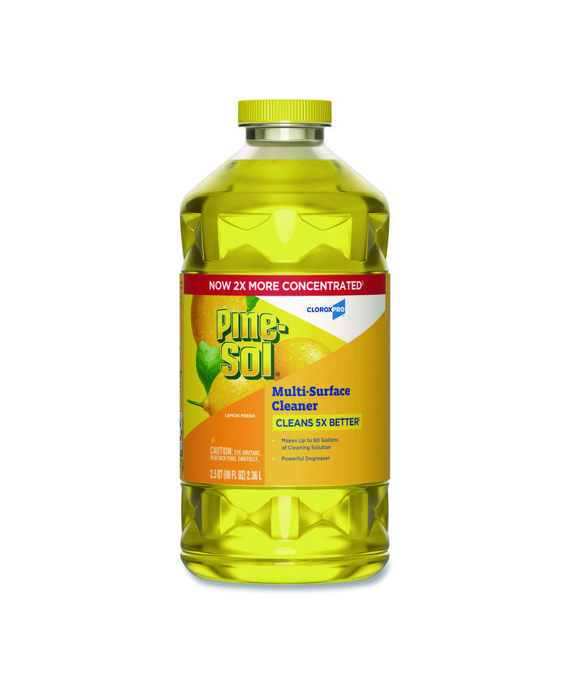 With Pine-Sol® Multi-Surface Cleaner from CloroxPro®, you only need one cleaner to fight tough dirt, grease and grime. This 2x concentrated formula delivers more cleaning power per drop and cleans 5x better than the previous Pine-Sol® scented formula. Easier to handle and easier to store, the space saving bottle size gives you more cleaning solution in a smaller bottle made of 30% less plastic. This multipurpose cleaner cleans right the first time, removing stains and deodorizing soft surfaces while leaving a pleasant scent. This powerful degreaser cuts through grime and soap scum fast and is safe for use on wood, tile, stone, porcelain and glass and more when used as directed on hard nonporous surfaces. Do not use on marble, aluminum, copper or wood that is unfinished, unsealed, unpainted, waxed, oiled or worn. Ideal for offices, daycares, schools, hotels, restaurants and more.