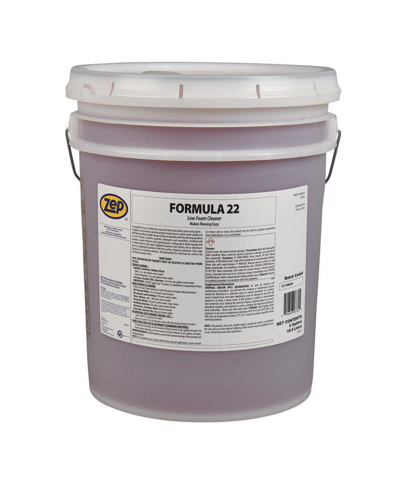 Formula 22 is a concentrated industrial cleaner formulation, suitable for application within federally regulated meat and poultry processing facilities. This highly potent liquid cleaner operates swiftly and efficiently, minimizing foam production to streamline the cleaning process and rinsing procedures. It comprises synthetic detergents, emulsifiers, fortified builders, water softeners, and a specialized grease-cutting agent. Designed to perform effectively in various water conditions, it is specifically formulated to safeguard delicate metals like aluminum. Upon rinsing, it leaves behind a pristine, residue-free surface and infuses a pleasant citrus aroma into the cleaning solution. Recommended for use on surfaces compatible with water, it serves as a low-foaming heavy-duty cleaner and degreaser, particularly for unfinished flooring materials such as concrete, ceramic tile, and terrazzo. With additional inhibitors to shield against soft metal degradation, it facilitates easy rinsing and leaves behind a streak-free finish. Compatible with auto-scrubbers, it offers the added convenience of a refreshing citrus fragrance. Complies with USDA regulations (designation A4).