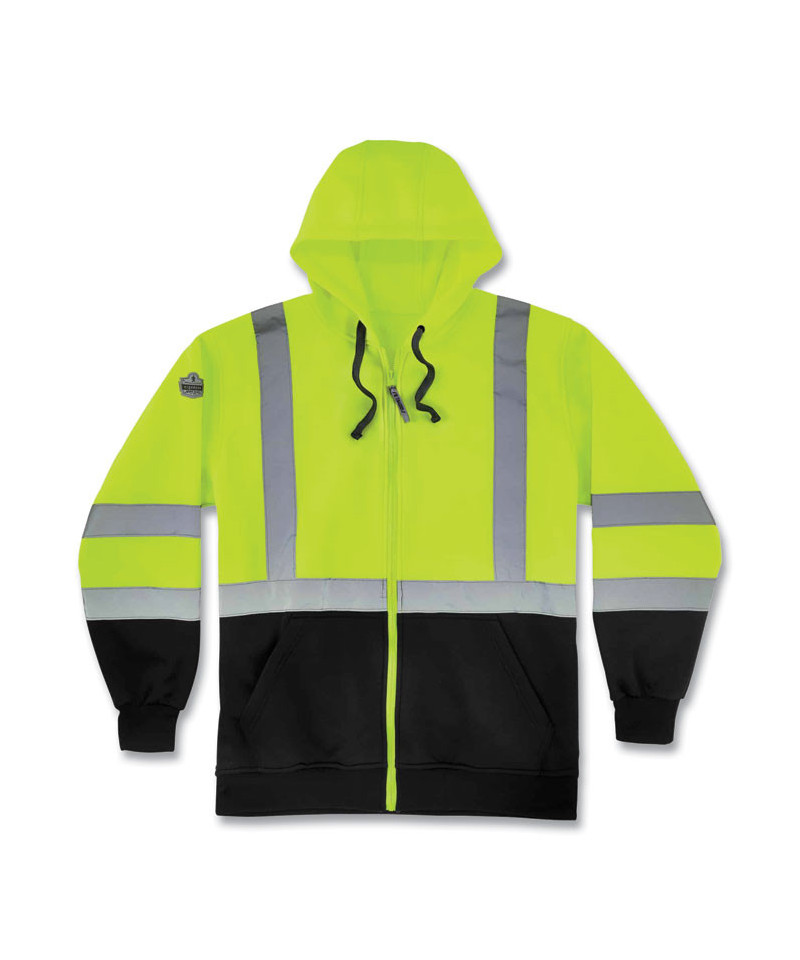 The GloWear 8372 Hi-Vis Zip-Up Hoodie with Black Bottom meets ANSI/ISEA 107-2015 Type R, Class 3 Standards for safety and is designed with high-quality 100% polyester polar fleece to provide conspicuity and warmth during chilly days. This safety sweatshirt has two slash-style pockets great for additional hand warmth and storage. The bottom front and wrist sections of the sweatshirt are black to prevent a dirty look where it matters most. There is 2 ANSI-compliant silver reflective tape on torso, shoulders and sleeves making this a great reflective hoodie to wear as night falls for effective visibility. The zipper front closure, drawstring hood and elastic knit waistband and cuffs keep the heat in for all-day warmth throughout the workday. It is perfect for jobsites in high-traffic areas like road construction or anywhere that requires high visibility clothing. It's also great for biking, snowmobiling, snow shoeing, ice fishing and all your outdoor adventures.