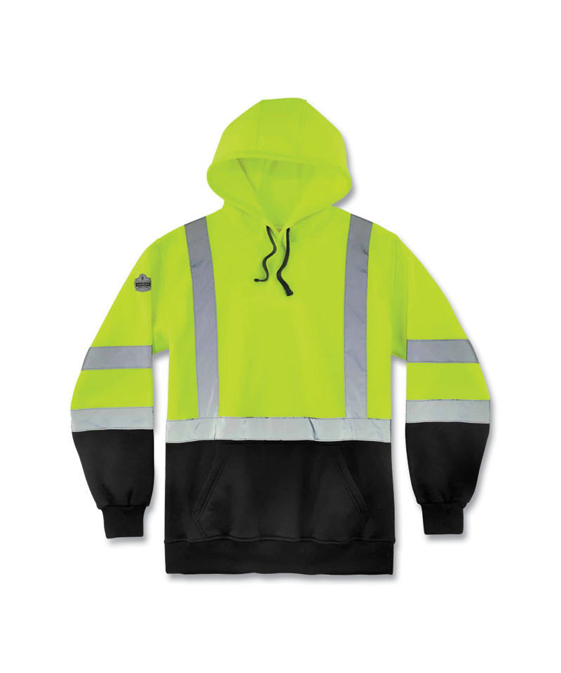 The GloWear 8373 Hi-Vis Pullover Hoodie with Black Bottom meets ANSI/ISEA 107-2015 Type R, Class 3 Standards for safety and is designed with high-quality 100% polyester polar fleece to provide conspicuity and warmth during chilly days. This safety sweatshirt has a pouch-style pocket great for additional hand warmth and storage. The bottom front and wrist sections of the sweatshirt are black to prevent a dirty look where it matters most. The contrasting high visibility yellow/lime color provides ultimate visibility. There is 2 ANSI-compliant silver reflective tape on the torso, shoulders and sleeves making it a great reflective hoodie to wear as night falls for effective visibility. The drawstring hood and elastic knit waistband and cuffs keep the heat in for all-day warmth throughout the workday. It is perfect for jobsites in high-traffic areas like road construction or anywhere that requires high visibility clothing.