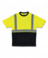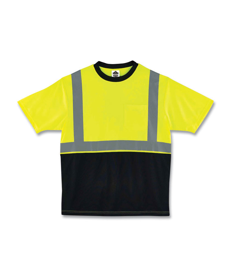 Lightweight birds' eye knit t-shirt with black front to keep high wear area looking clean. Moisture wicking treatment keeps you dry. 30+ UPF for protection against harmful UV. 2 ANSI-compliant heat transfer reflective. Features one outside chest pocket.