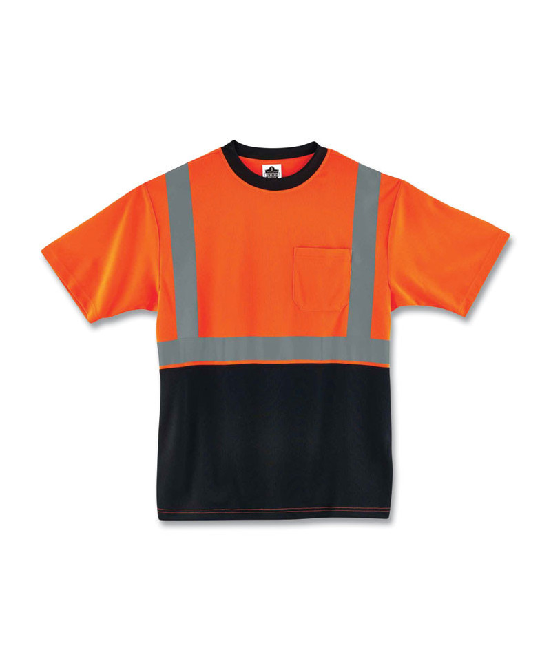 Lightweight birds' eye knit t-shirt with black front to keep high wear area looking clean. Moisture wicking treatment keeps you dry. 30+ UPF for protection against harmful UV. 2 ANSI-compliant heat transfer reflective. Features one outside chest pocket.