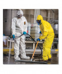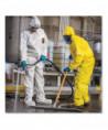 Protective Saranex 23-P shields wearers from dangers on-the-job. A soft fabric lining increases comfort for long-wear. A seamless front provides extra protection in the primary area of exposure. Taped seams and sealable storm flap deliver extra security. Strong, rip-resistant REFLEX* design provides more chest-room and a longer torso to ensure a more comfortable fit. Attached foot covering leaves plenty of room for shoes and boots, ensuring all-over protection. Respirator hood for convenient, over-the-head coverage.