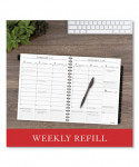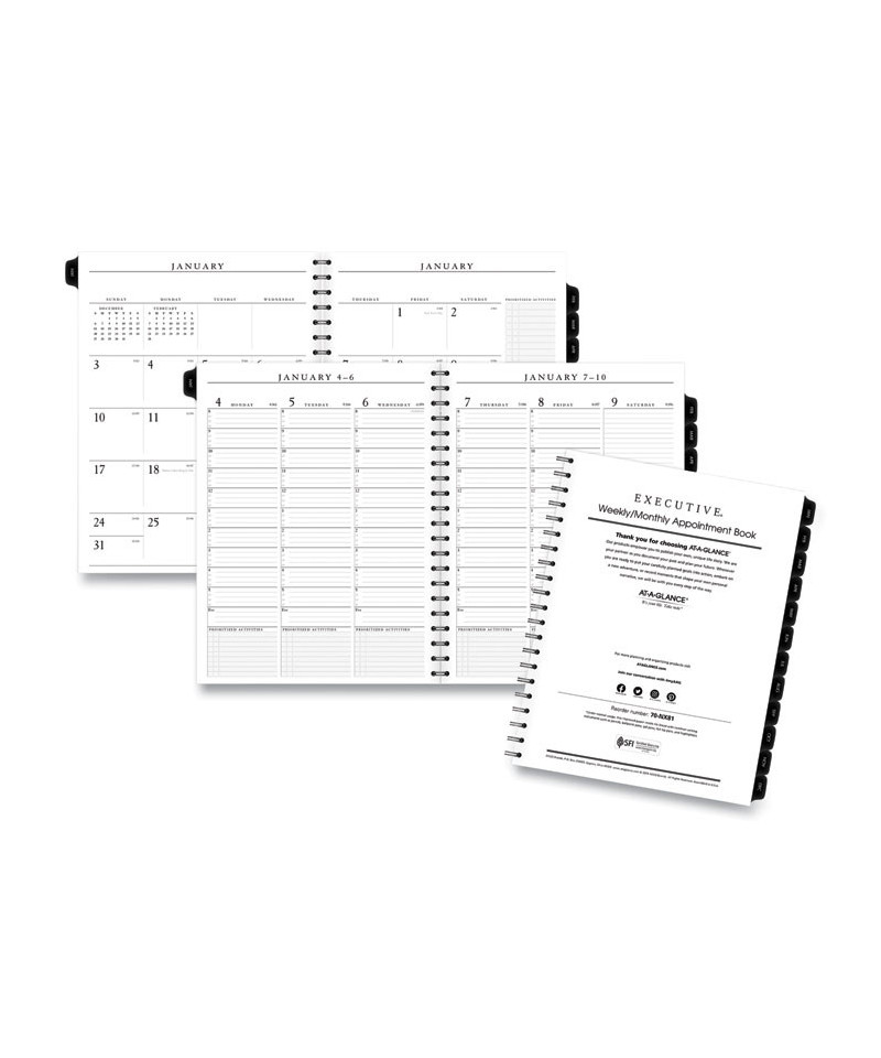 Premium paper resists ink bleed. Weekly: one week per two-page spread, column-style appointments. Monthly: one month per two-page spread with unruled blocks; past and future months reference; Reinforced tabs. Removable telephone and address book. Expand your organizational skills with special pages. Includes reference calendars, future planning pages, expense tracking, important dates and notes pages.