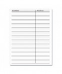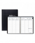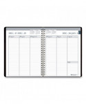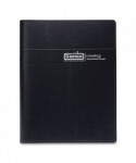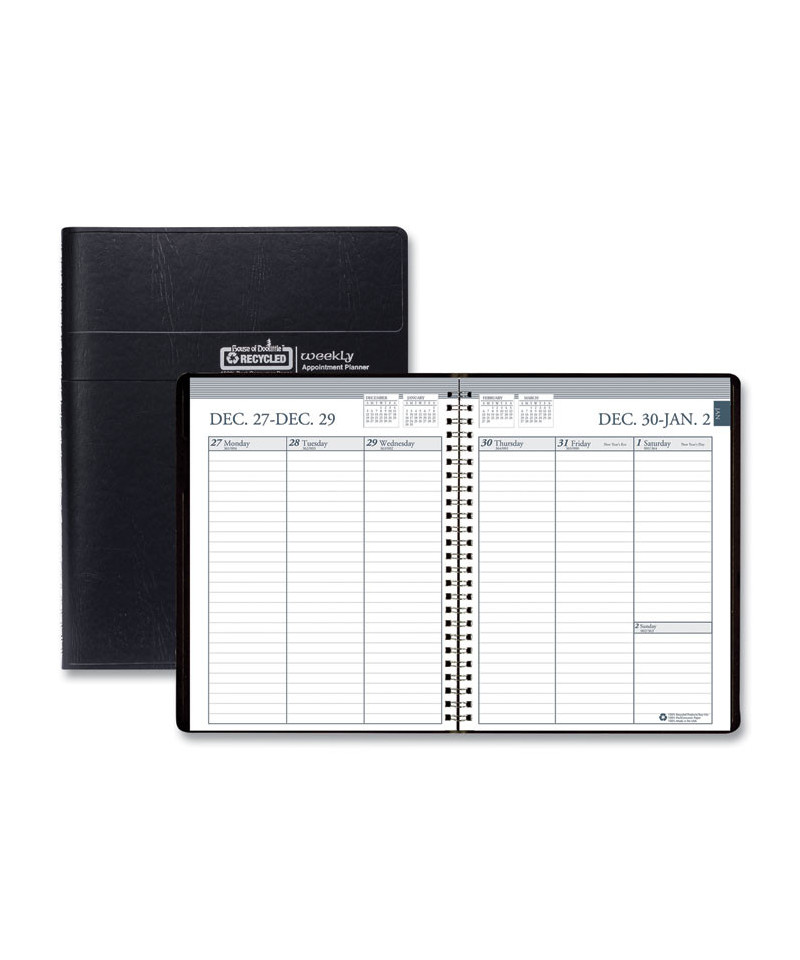 Full-week view on each one-page spread with open-schedule ruling to accommodate a flexible appointment scheduling. Columnar format provides one column per weekday and one combined column for Saturday and Sunday. Future-planning section for the following year, a memo section and a name/address section, a three-year reference calendar page for long-range planning and an important holiday date list spanning three years. Made entirely of recycled materials.