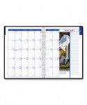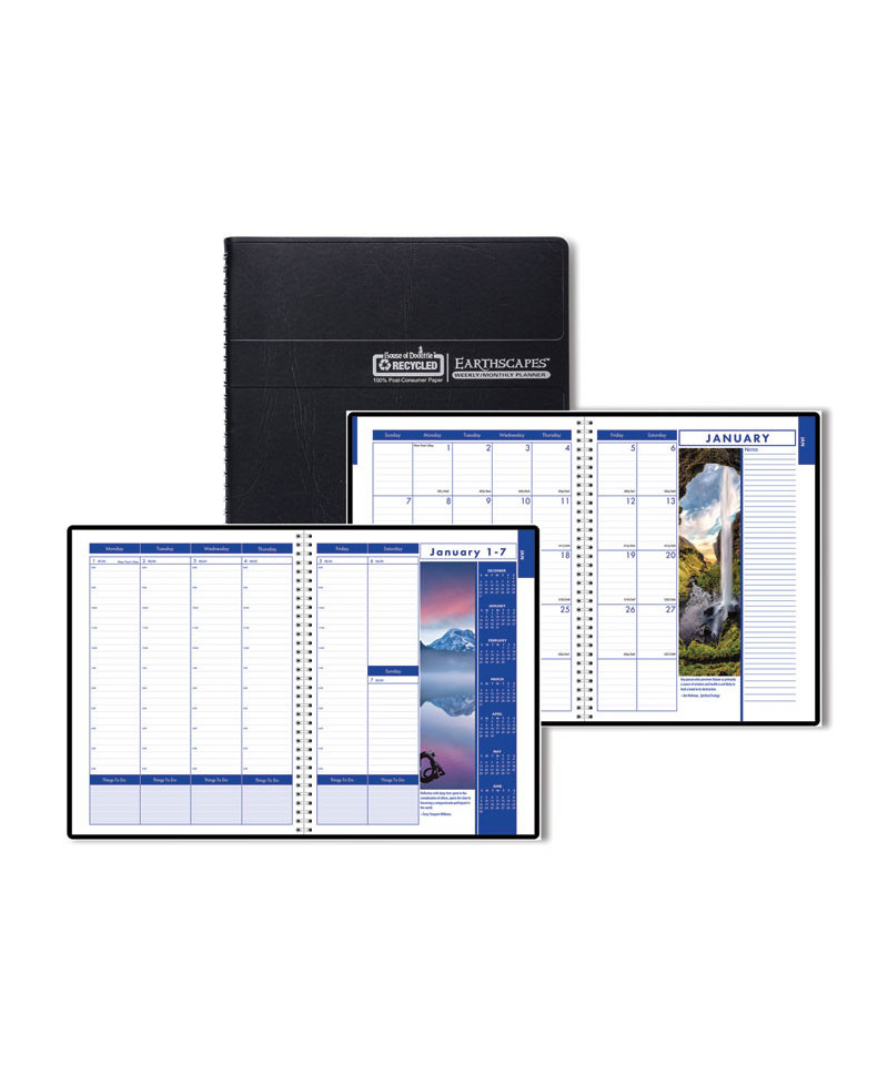 Enjoy nature scenes while scheduling your appointments and keeping yourself organized. Monthly and weekly spreads feature open note space and brightly colored die-cut tabs to help you quickly find the date you need. Reference calendar page detailing the current year and the next two full years, phone/address section for important contacts and an additional page with important holiday dates for three years. Includes a double-sided storage pocket. Black, embossed simulated-leather cover withstands daily use throughout the year. Made entirely of recycled materials.