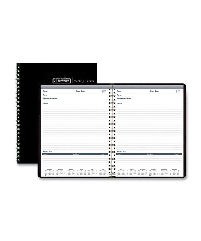 A perfect planner to keep all of your meeting information. It features 110 pages for notes and follow-up action listings. The heavy, two-piece, hard leatherette book cover folds over to make taking notes easy, even without a writing surface. Each page has ample space for recording your meeting agenda, action items, attendees, topics and notes. Each spread has a full-year reference calendar. Made entirely of recycled materials.