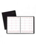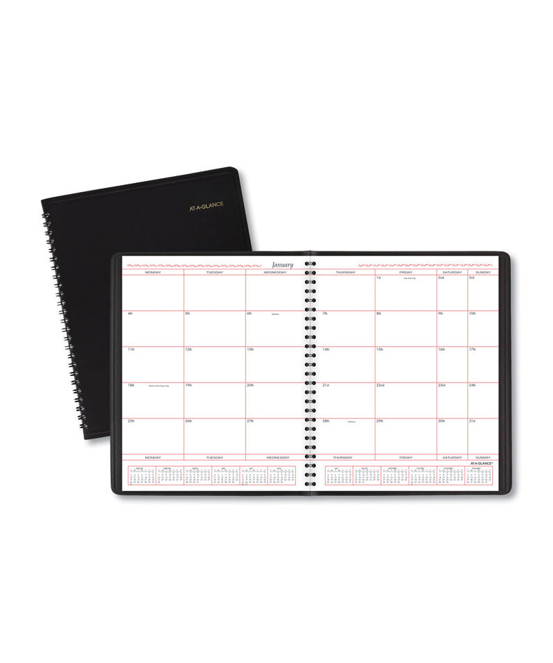 Cool design with Monday start provides a great way to see your weekends together. Premium paper resists ink bleed. Perforated memo section for easy tear-out notes. One month per two-page spread with unruled blocks and full-year calendar reference across bottom. Indexed telephone/address section.