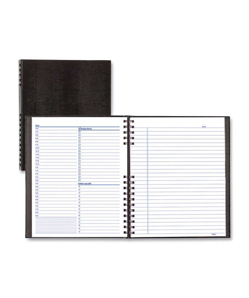 Durable hard cover with twin wire binding. Action item list and phone log on each page spread, appointment schedule in 30-minute intervals and lined note space on left-hand pages. Includes self-adhesive tabs and storage pocket.