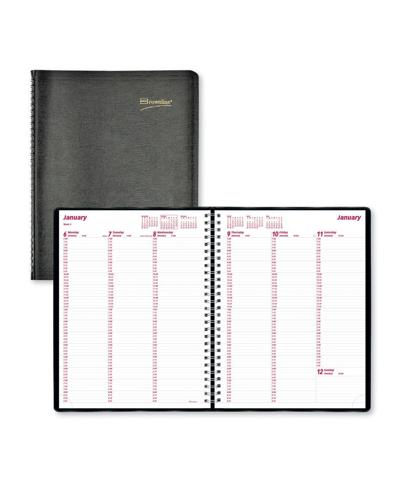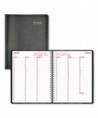 15-minute appointments for six days a week and ruled space for Sunday. Six-month calendar reference blocks for help with planning. Includes contacts (telephone/address) section. Numbered weeks start on Sunday. Countdown of days passed, days to come (Julian dates). Tear-off corners. Twin-wire binding.