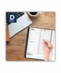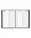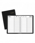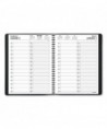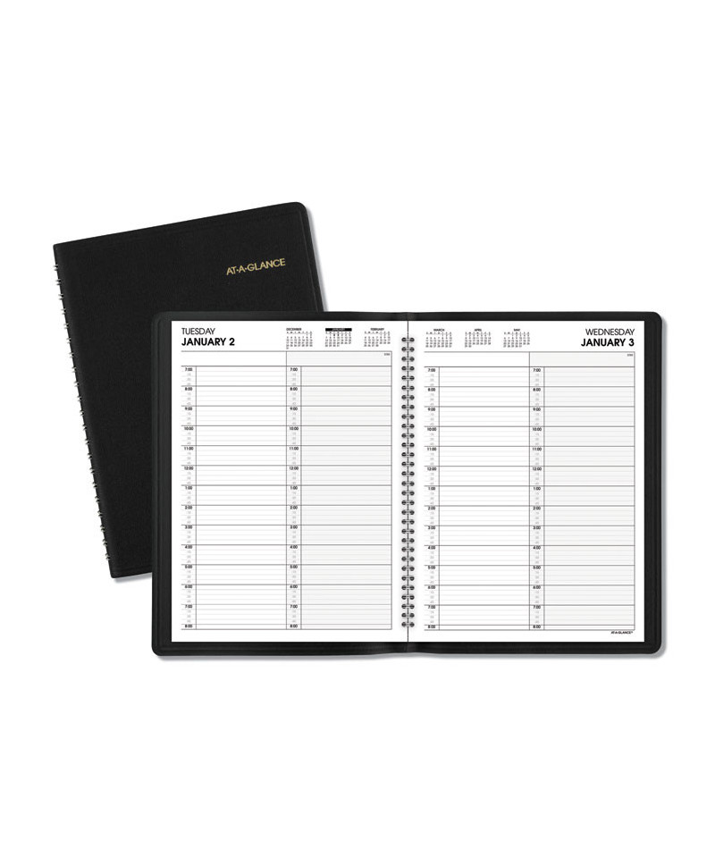 An AT-A-GLANCE Two Person Daily Appointment Book is the perfect solution for side-by-side planning for up to two people. One day per page layout shows two columns with quarter-hourly appointment times for detailed planning of daily tasks and meetings. Two person daily appointment book covers a 12 month date range from January to December. High-quality paper features superior ink bleed resistance. One day per page spread shows two vertical columns, one for each person, to keep the multi-person planning neatly organized and easy to read. Features quarter-hourly appointment times from 7AM to 8PM on weekdays and 7AM to 6PM on Saturday. Two past and current month reference calendar and four future months are shown on each spread for quick date checking. Planner has a black faux leather cover with twin wire binding. 8" x 11" page size.