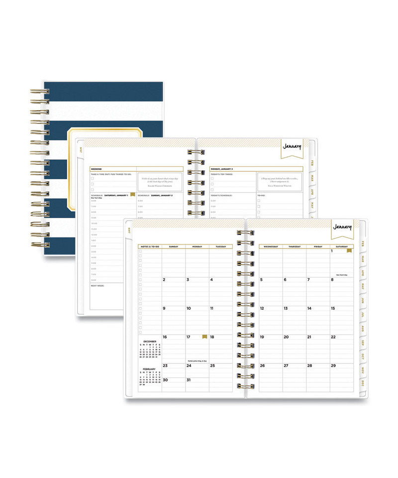 Design your life with Day Designer, the simple and easy system created to help anyone find balance while they boost their productivity. An introductory letter from Whitney English and special worksheets designed for identifying and fulfilling your personal goals get you started. In the back of the book, reference calendars, a yearly goal checklist, holiday lists and ample notes space help you keep your momentum. Daily planner section features one-day per page views Monday through Friday and two-day per page views for Saturday and Sunday, all with a vertical appointment format, to-do lists, a ruled notes area, space for your top three priorities and an inspirational quote. Two-page per month spreads feature ruled daily blocks, holidays listed, reference calendars and a Notes & To Do checklist. Durable, coated monthly tabs allow for easy navigation. Six past-year monthly views simplify yearly transitions. Flexible front and back covers feature an attractive navy stripe design, and the strong twin-wire binding ensures easy page turning. Thick, premium quality pages provide superior ink-bleed resistance.