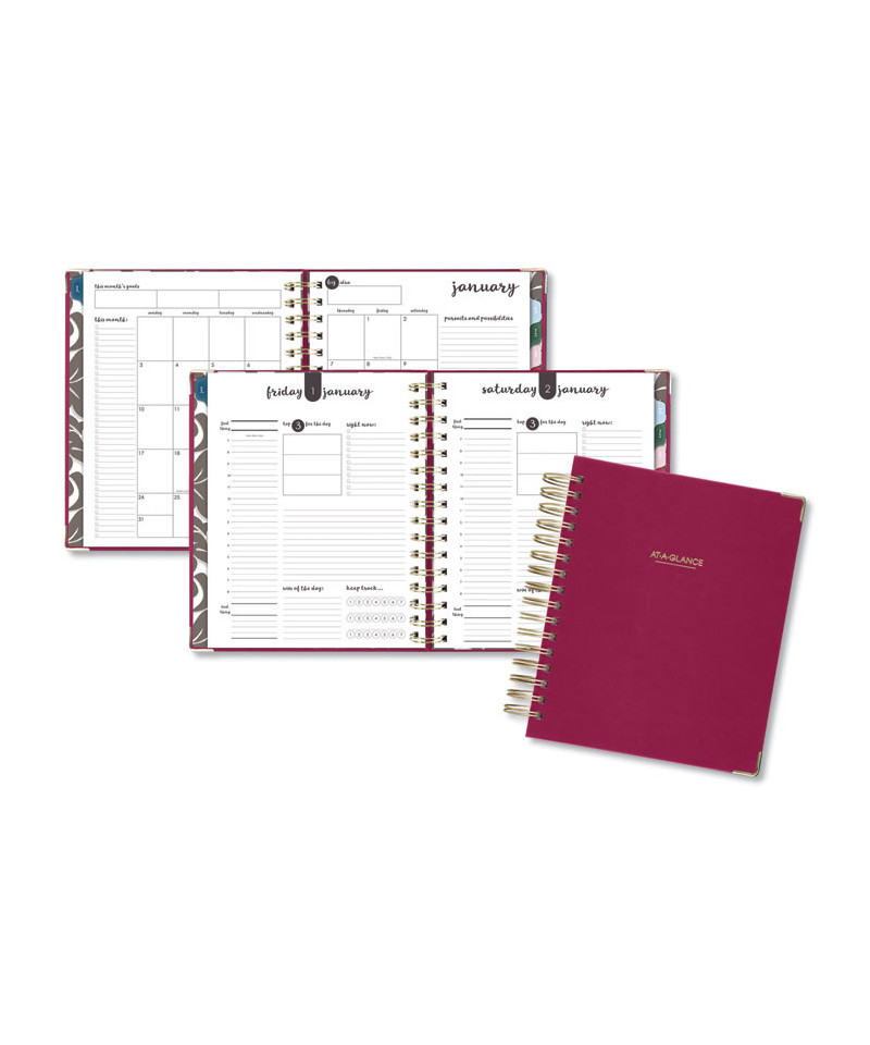 The AT-A-GLANCE® Harmony Daily/Monthly Planner features a stylish berry hard cover and chic gold accents. Covers 12 months Jan Dec for complete planning throughout the calendar year. The one day per page format has hourly appointment times 7:00 a.m. 8:00 p.m. to track appointments and meetings. Daily pages also have sections to list priorities, make checklists, track goals, plan for the future and reflect on "wins of the day." One month per two page spreads have unruled daily blocks and space to list goals, monthly checklists and pursuits and possibilities. Each month is tabbed to quickly flip to any date. Special pages include a holiday listing, 3 year reference calendars, future planning pages, gift ideas, important dates, contacts and expense tracking. Double-sided interior pocket stores loose papers. Includes repositionable stickers in four different colors to track multiple projects, people or events. Wirebound with hardcovers.