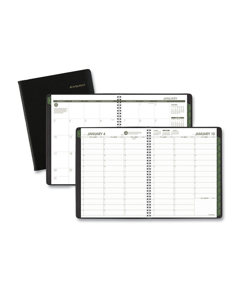 Use products with high post-consumer recycled materials content. Features tips for "green living" each week. Weekly: one week per two-page spread; past, current and two future months reference. Monthly: tabbed one month per two-page spread with unruled blocks; past, current and four future months reference. Telephone/address pages.