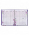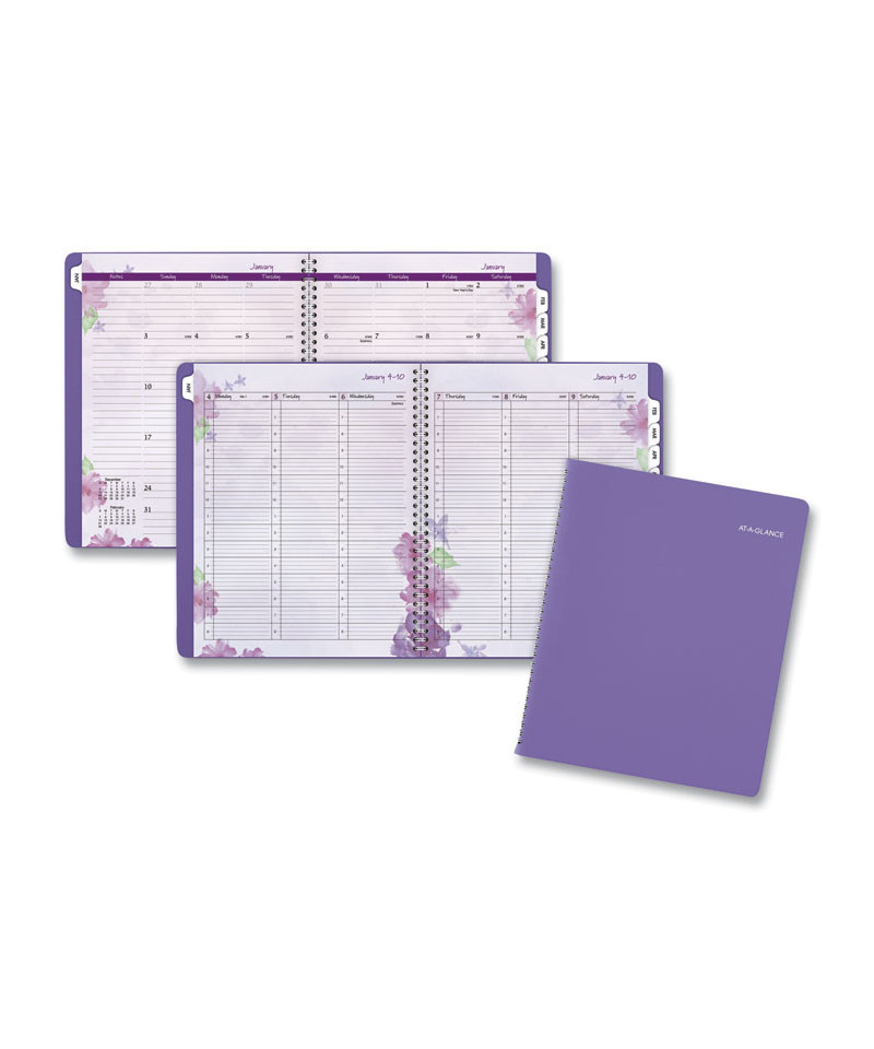 Keep your plans organized behind lavender, soft touch covers. Interior pages feature a watercolor floral design and each quarter of the year is designated by one of four colors. One week per two page spread with ruled planning space lists hourly appointment times from 8:00 a.m. to 5:00 p.m. each weekday. Weekends are condensed and untimed.