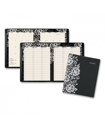 Features a floral motif and gold date badge. Planner covers 13 months from January to January with Julian dates. High-quality paper features superior ink bleed resistance. One week per two-page spread has ruled planning space for each day, plus an area to jot down weekly goals and a notes section. Tick marks let you customize and plan for multiple activities. One month per two-page spread has unruled daily blocks, notes space, and past/future month reference calendars. Each month is tabbed in rotating colors. Special pages include a holiday list, 7 contacts, 6 notes, 3-year reference calendar and event calendar. Double-sided poly pocket stores loose sheets. Interior pages feature a clean font printed in a rotating complementary palette. Durable cover has gold twin wire binding.