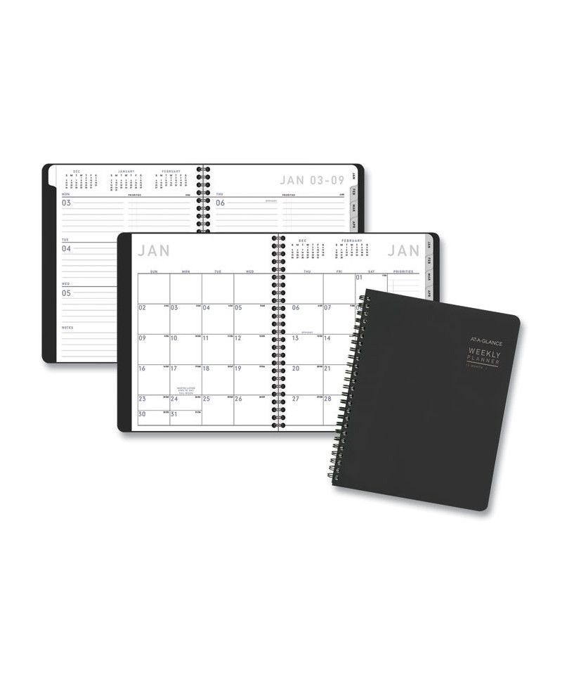 Simplify the way you organize your year with the sleek and professional AT-A-GLANCE Contemporary Lite Weekly Monthly Planners. It includes weekly and monthly planning pages with a modern design for easy planning all year long. Perfect for long-term planning and staying on track, this planner covers a 12-month date range from January to December. High-quality paper features superior ink bleed resistance. One week per two-page spread has ruled planning space for notes and priorities Monday through Friday. Weekends are condensed. One month per two-page spread with unruled daily blocks, a column to list priorities and a tab for easy navigation. Planner has twin-wire binding, black cover and gold accents.