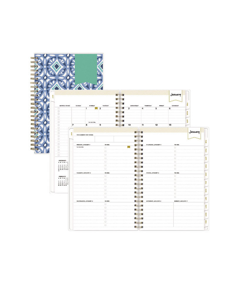 Featuring a simple and easy system, this planner is designed to help you set your goals, track your progress and achieve what you set out to do. Weekly spreads feature plenty of space for your daily schedule, to-dos, notes and more. Tabbed monthly spreads allow for more long-range planning with daily blocks and space for month-spanning to-dos and notes. Beautiful cover features tile geometric artwork and snag-free, polished metal twin-wire binding.