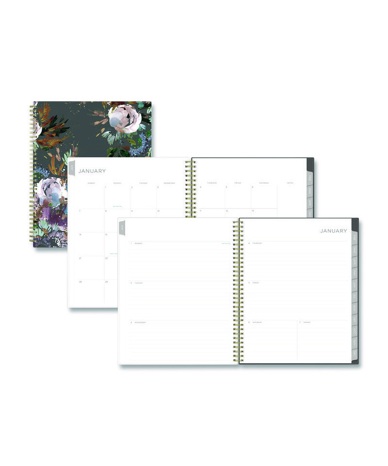 Plan your way through the year with this beautiful Kelly Ventura for Blue Sky® book. Inspired by the summertime blooms around her Michigan studio, this full-year planner features a lush Midnight Garden floral design with elegant gold foil accents and polished metal twin-wire binding. Track appointments, reminders, ideas and to-do lists on the weekly spreads, and streamline your schedule with the big-picture monthly views. Each month is marked with a durable laminated tab for easy access. In the back of the book, you'll find handy reference calendars and extra notes space for everything that doesn't quite fit into any one month or week. Six bonus past-year, un-tabbed monthly spreads simplify annual transitions.