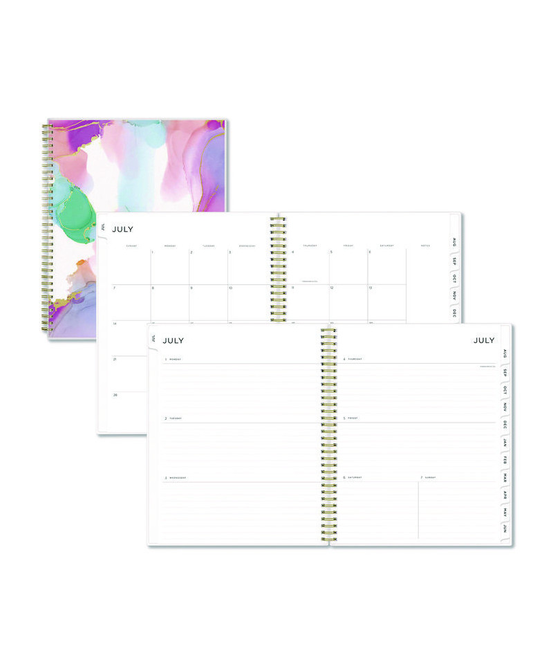 Enjoy stand-out style with this planner's pink, blue and green Multicolor Smoke cover design and gold twin-wire binding. Inside, a motivational title page gets you started with a customizable list for your school year goals; and beyond the first page, use the planner's open-format weekly spreads to stay on top of your day to day. Coordinate your weekly scheduling tasks with the tabbed monthly spreads to keep yourself poised for what's to come; and throughout the year, stay organized with dedicated pages for your yearly goals, contacts, important dates and more. Thick, premium quality paper stock minimizes the potential for ink bleed through.
