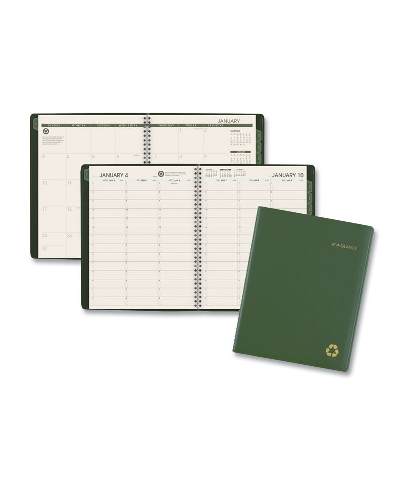 Use products with high post-consumer recycled materials content. Features tips for "green living" each week. Weekly: one week per two-page spread; past, current and two future months reference. Monthly: tabbed one month per two-page spread with unruled blocks; past, current and four future months reference. Telephone/address pages.