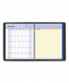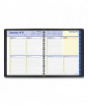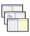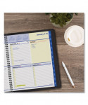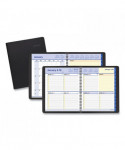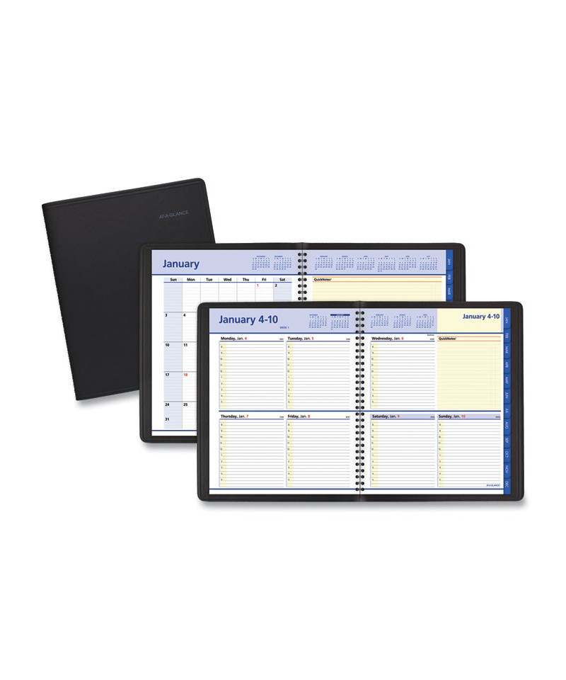 Yellow highlighted section for notes and to-do's. Premium paper resists ink bleed. Includes storage pocket. Weekly: one week per two-page spread with QuickNotes® area. Monthly: step-tabbed full month with ruled blocks on left page, QuickNotes® area on right page; two past and six future months reference. Federal holidays highlighted.