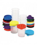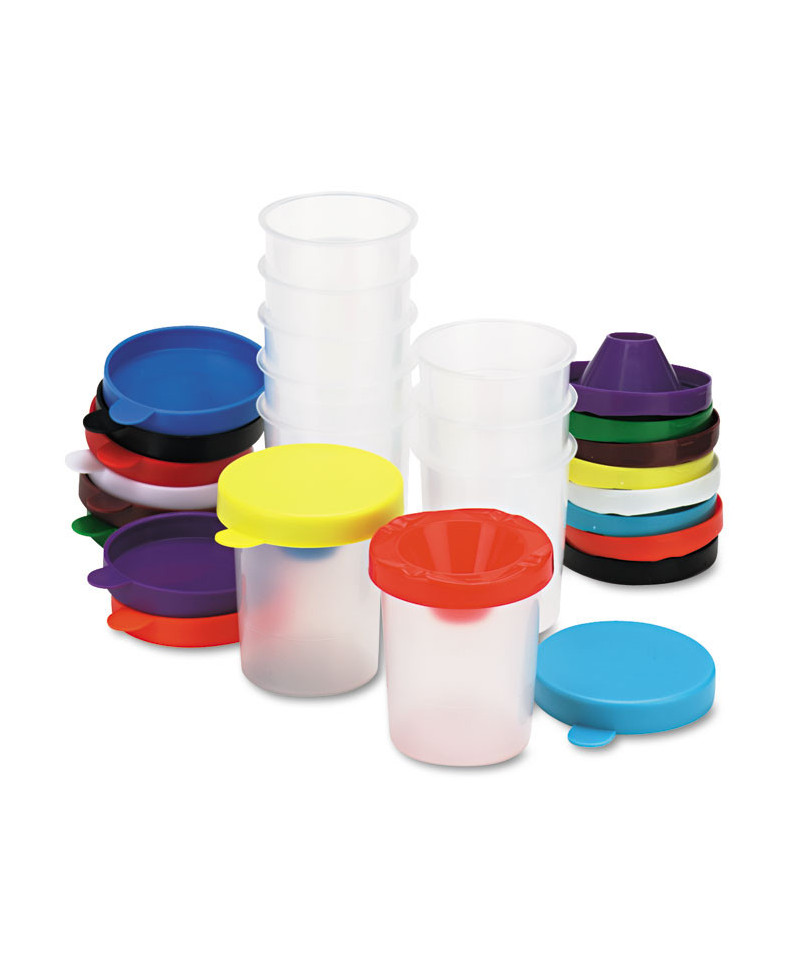 No more spilled paint with these dual-lid storage cups. Outer lid seals cup securely; inner lid keeps paint from spilling out if cup gets knocked over. Lid color easily identifies the color of paint inside. Also serves as a brush holder. Plastic.