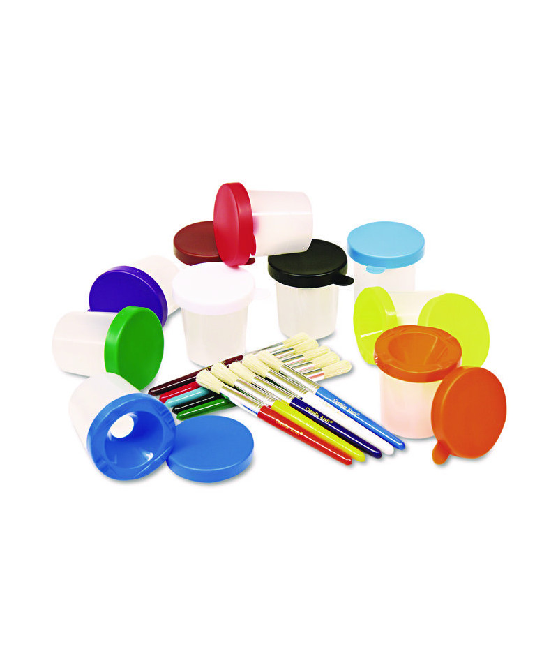 Keep painting projects tidy with this cup and brush pack. Smart set features no-spill cups with lids in assorted colors and color-coordinated brushes. Dual lid has an outer lid that seals cup securely and an inner lid that keeps paint from spilling out if cup gets knocked over.