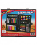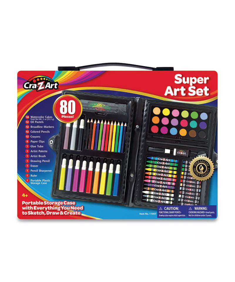 Who new anyone could be so creative! This Supaer Art Set will follow young artists everywhere they go to keep them creatively inspired and engaged for hours. When there's a flash of inspiration, they will be ready, and so will all 80 pieces, including 12 broad line markers, 12 crayons, 12 colored pencils, 12 oil pastels, 1 ruler, 18 watercolors, 1 pencil sharpener, 1 eraser, 1 artist palette, 1 artist brush, 1 drawing pencil, 1 glue tube, 6 paper clips and 1 portable plastic storage case that doubles as a mini travel easel. Encourage endless creative exploration with different colors, textures and tools. Once done, kids can conveniently pack up in a snap and go!