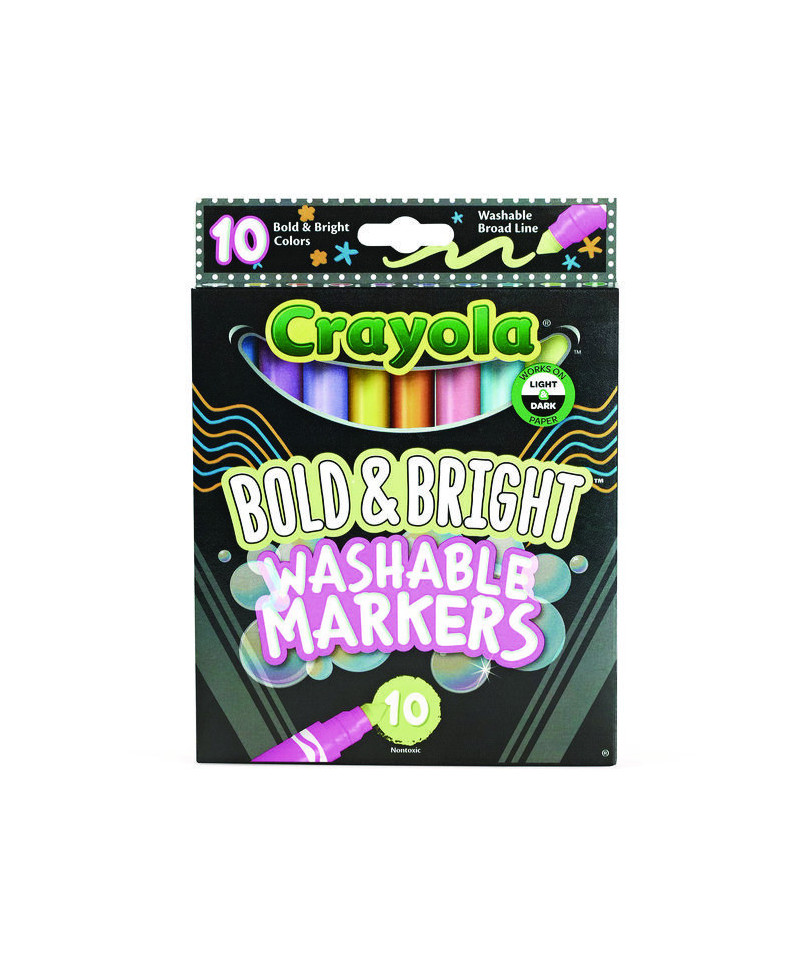 Crayola broad line markers are essential kid art supplies both in and outside the classroom, and now with Bright and Bold Crayola colors, they make a statement on light and dark paper. Perfect for beginner artists, this washable marker set washes away from skin and most washable clothing. Whether kids are coloring in their favorite coloring pages or drawing pictures for class, each marker features a conical tip that can be used for thick or thin lines.