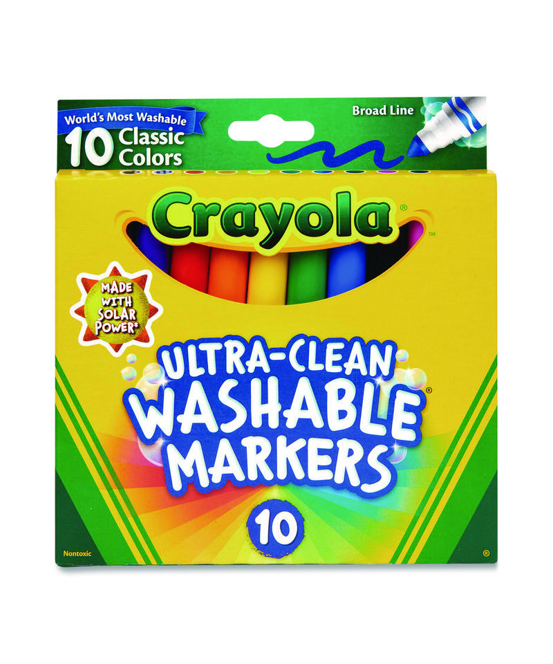 Keep color where it belongs with Crayola® Ultra-Clean Washable Markers, the perfect choice for worry-free creativity. Featuring vibrant Color Max Ink technology, these markers deliver bold, long-lasting color without bleeding through the page, ensuring clean and beautiful results every time. Designed with parents and teachers in mind, the ultra-washable formula easily rinses off skin, walls and most washable clothing, making cleanup a breeze. Ideal for classrooms, art projects and home use, these markers provide bright, vivid colors that inspire creativity while keeping messes under control. Let kids explore their artistic side confidently with these reliable, easy-to-clean markers.