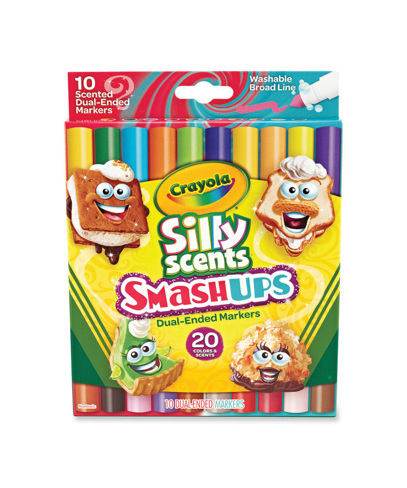 The Crayola® Silly Scents Markers you know and love-now available in Smash Ups! This scented marker set features 10 dual ended broad line markers in 20 colors and sweet-smelling scents including Orange Dreamsicle, Orange Gingerbread Cookie, Mint Chocolate Chip, Berry Smoothie, PB&J Sandwich, Smore, and more. Plus, scented school supplies are the perfect way to celebrate back to school and get kids excited to create! Each of these Crayola® scented markers is washable from skin and most washable clothing, making them great for school supplies and coloring on the go. Pair them with a Crayola® coloring book for a fun bundled gift idea, and make someone's day sweeter.
