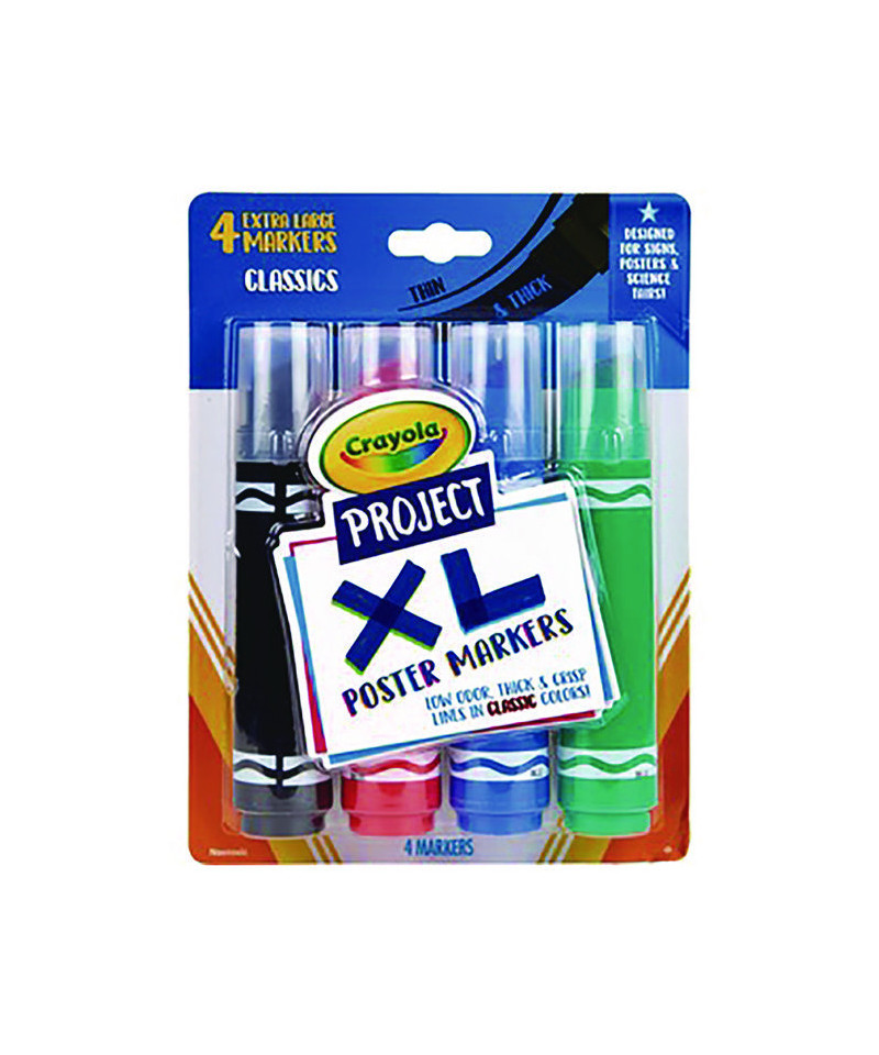 Make your assignments shine with the Crayola Project™ line. Though designed for posters, signs and science fair materials, these supersized markers are ideal for a wide variety of arts and crafts projects. No matter where you wish to aim your creativity, XL Poster Markers' full coverage design can help you hit your target. Their unique, thin and thick chisel tips are 50% wider than common marker nibs but taper to a fine, sharp point, allowing you to create super thick lines or very thin ones, depending on what you need to do at the time. School projects, presentations, posters, signs, decorations and more can more vividly stand out with crisp, neat lines when you choose Crayola® XL Poster Markers. Safe and washable, low-odor, non-toxic ink—ideal for children and adults, alike.
