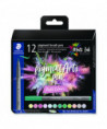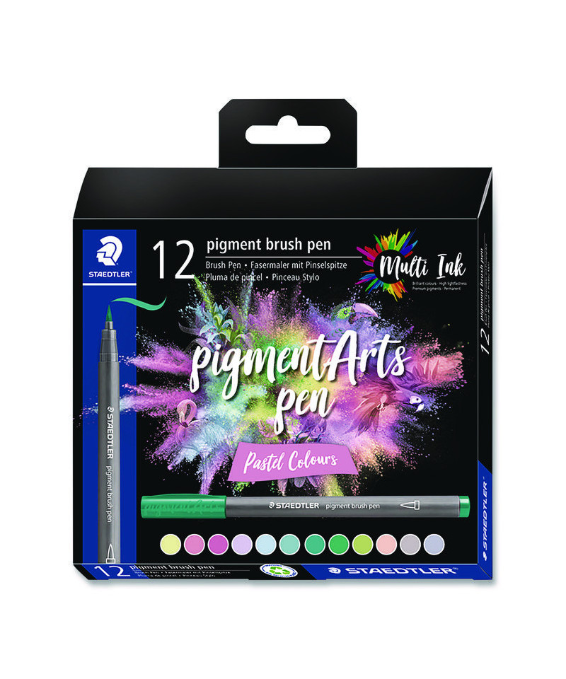 Setting a new standard for color brilliancy and lightfastness, Staedtler® pigmentArts™ Pigment Brush Pens' Multi Ink system employs premium pigments and a permanent, water-based medium to deliver paint-like performance in an easy to control pen-style marker. Once their quick-drying ink has dried, you can also overpaint without worrying about smudging, ghosting or color-bleed. Supporting use on a wide variety of surfaces, their high-quality brush tips provide excellent control and line-width versatility, making Pigment Brush Pens ideal for calligraphy, illustration, drawing, coloring and a wide variety of mixed-media projects.