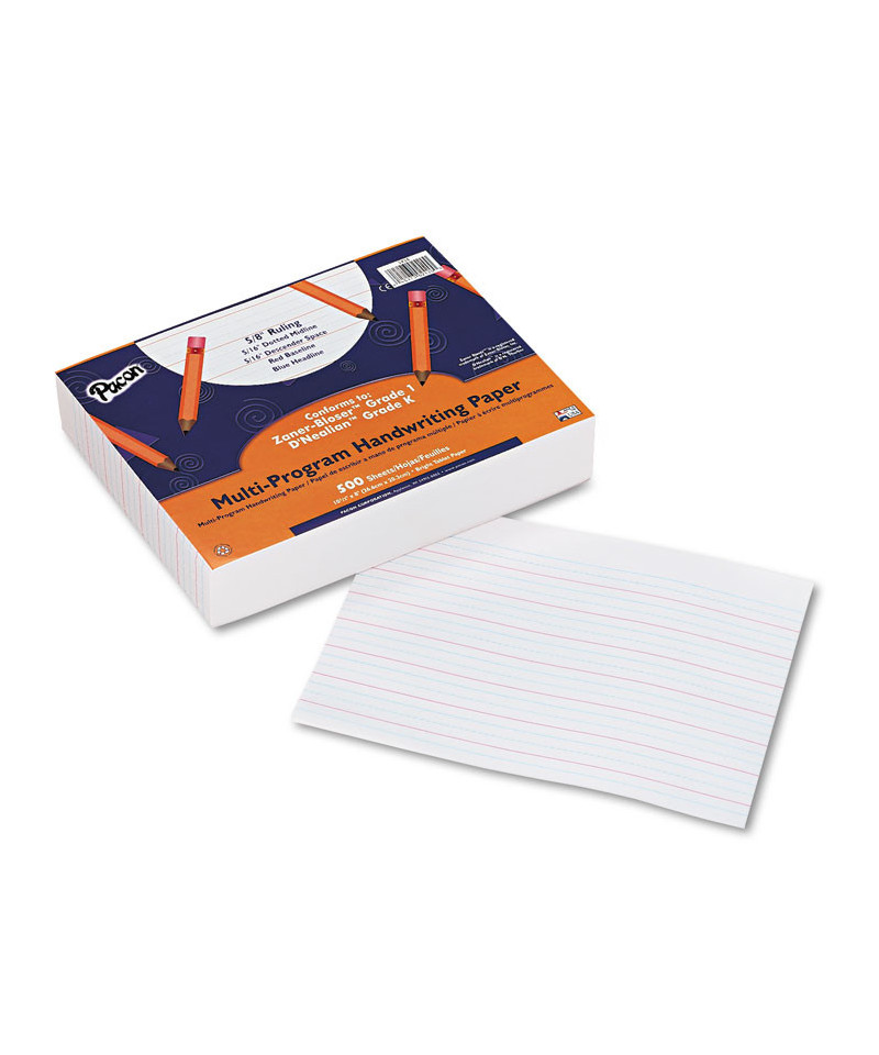 Rulings conform to Zaner-Bloser™ and/or D'Nealian™ handwriting programs. Bright tablet paper ruled on both sides with red baselines, blue dotted midlines and blue headlines.